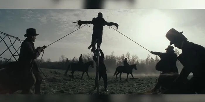 On notera la présence d’un plan séquence (peut-être que le monteur était partie en pause…) qui laisse vivre – ou mourir – l’action. On découvre alors le massacre du peuple gitan par les colonisateurs, avec un cadre mettant en valeur son ratio de 2.35 au profit d’un large champ visuel. On a une véritable progression, de l’arrivée des intrus au camp, au premier coup de feu, jusqu’à la fin du massacre.