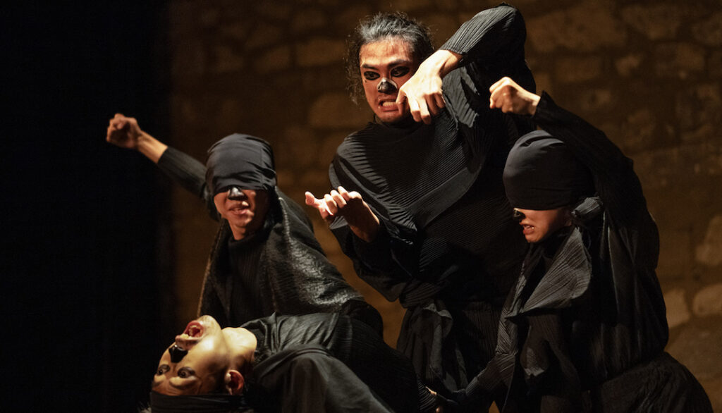 Et lorsque certains comédiens-danseurs se recouvrent les yeux d’un tissu, on est admiratif de leur synchronisation qui demeure parfaite. Leurs corps-instruments, qu’ils utilisent parfois comme des percussions en tapant du pied ou en frappant du poing leur torse, ondulent, se déploient, miment, tombent, se relèvent. La proposition est riche et nous emmène vraiment loin de tout ce à quoi nous sommes habitués.