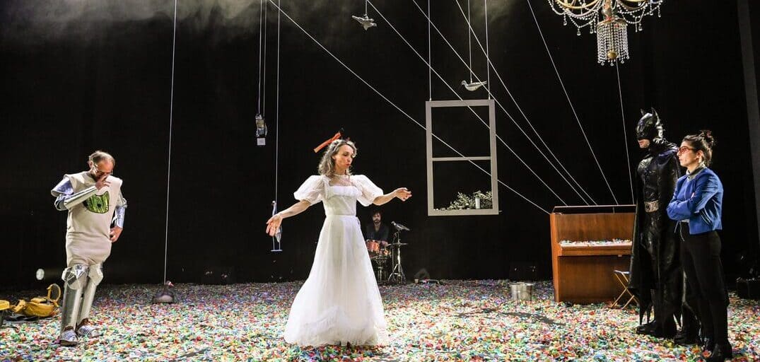 Tout commence sur un ton plutôt léger, pourtant. Matthias et Anna débarquent sur scène, lui en armure de chevalier, elle déguisée en mariée morte, une hache plantée dans la tête. Au beau milieu de leur échange, qui part un peu dans tous les sens, se glissent soudain quelques mots au sujet de « la tombe de leur fille ». On comprend alors que la légèreté apparente n’est qu’un mirage. Comme ce tapis épais de confettis qui recouvre la scène, ou ce lustre échoué sur le sol et que l’on tentera de raccrocher, en vain. Car la lumière n’est pas si simple à rallumer quand on a été frappé par un drame comme celui-là.