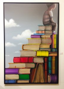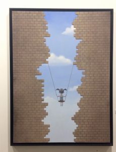 L’imaginaire comme refuge. Les enfants sans visages des œuvres de Seth s’échappent du réel et vont s’abriter dans un monde intérieur. C’est pourquoi il est souvent question de murs. Des murs que l’on abat pour rejoindre l’autre, pour se frayer un chemin vers un univers imaginaire ; ou que l’on construit pour se protéger. Et chaque création nous happe, nous attire vers un ailleurs plutôt sombre, mais où la couleur parvient toujours à se faufiler. Et parfois même à embraser l’espace.