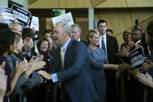 Kevin Spacey et Robin Wright trinquent-ils à leur future victoire ? En tout cas, la série va faire plus que jamais écho à la récente élection américaine mais la productrice exécutive, Melissa James Gibson, a rappelé à EW qu’il ne pouvait pas y avoir de confusion possible : « Trump était un outsider qui a essayé de faire sauter le système. Francis c’est l’opposé ».